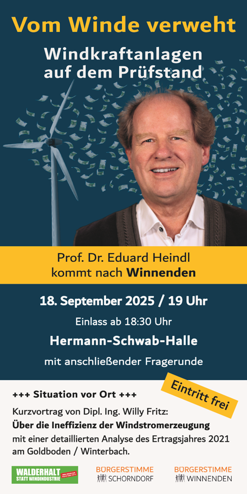 Titel des Vortrags: "Vom Winde verweht" – Windkraftanlagen auf dem Prüfstand. Prof. Dr. Eduard Heindl und Dipl. Ing. Willy Fritz