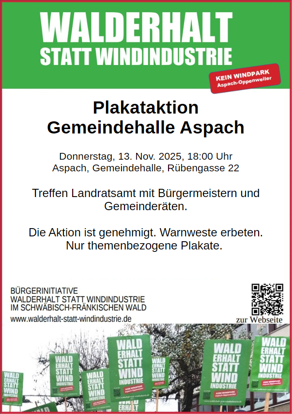 Der Bürgerwille muss gezeigt werden! Wir versammeln uns mit Plakaten vor der Gemeindehalle in Aspach um 18.00 Uhr. Dort trifft sich das Landratsamt mit den Bürgermeistern und Gemeinderäten aus Aspach, Oppenweiler und Spiegelberg. Wir sollten ein deutliches Zeichen setzen.